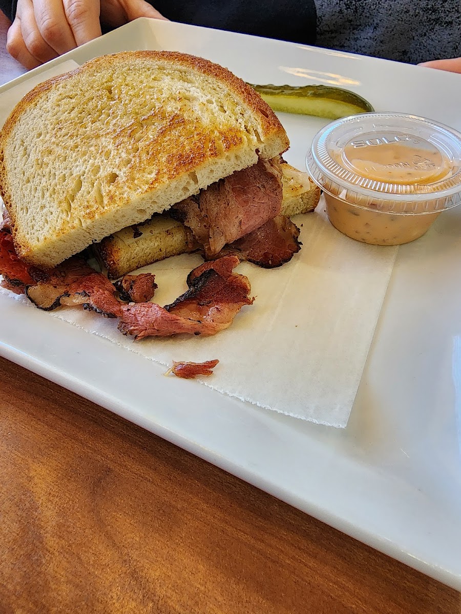 Super quick service. And very friendly staff. Lola & the others are great. Refilling drinks before asking, checking just enough. My thought: If you put an item on your sign, it better be good. I'm starting with that. Corned beef & Swiss sandwich ($12) with slaw & side salad (deluxe, $5 additional). Need me some veggies. Salad & slaw showed up quickly. A big portion of coleslaw and tasty, too. The salad is not just lame iceberg, it has spinach, onion, cucumber & tomato. Before I could get halfway through my salad, my sandwich arrives. Thinly sliced corned beef on thick-cut rye bread. A hearty sandwich, indeed.(I love the square dishes, too.)