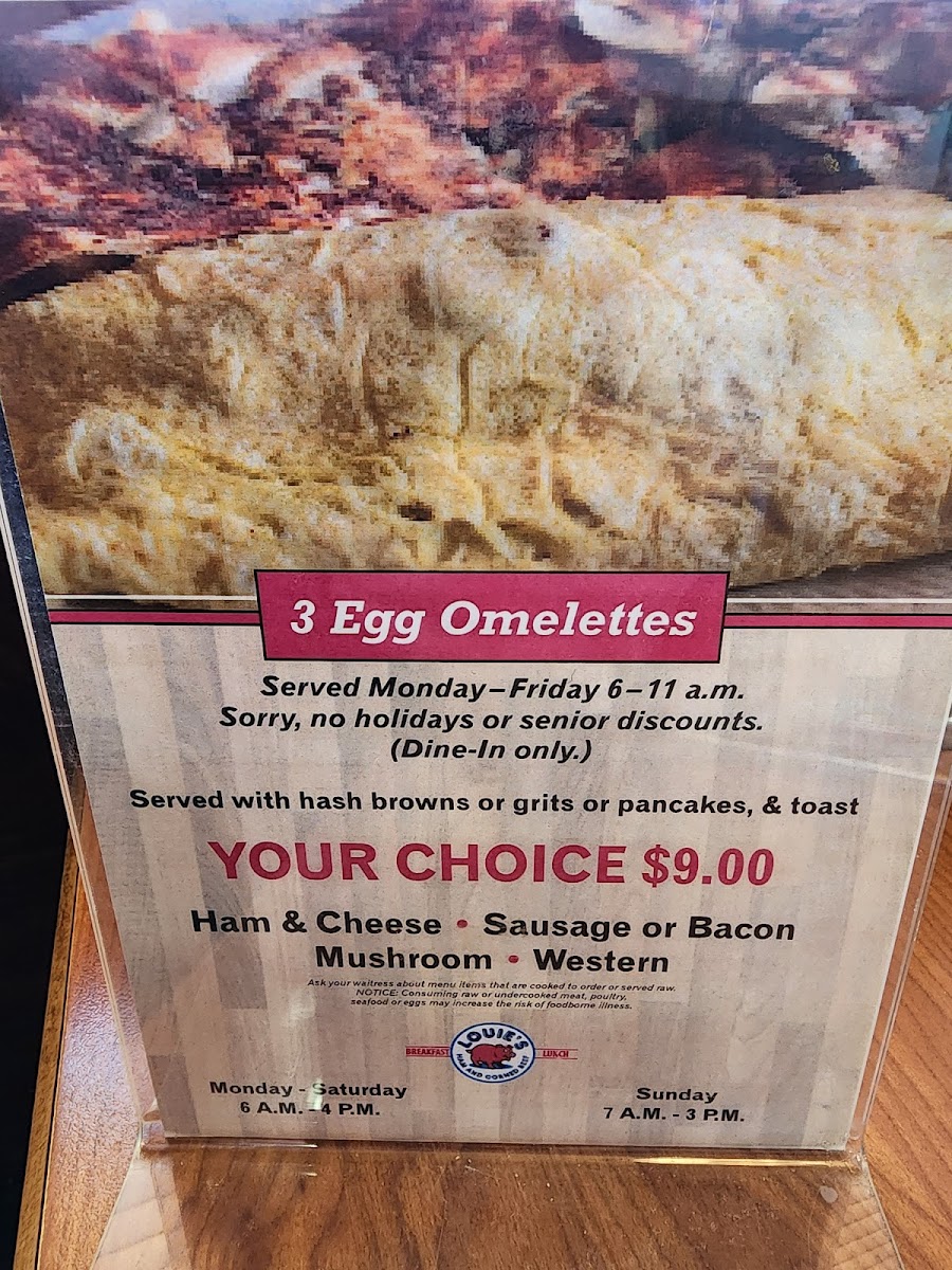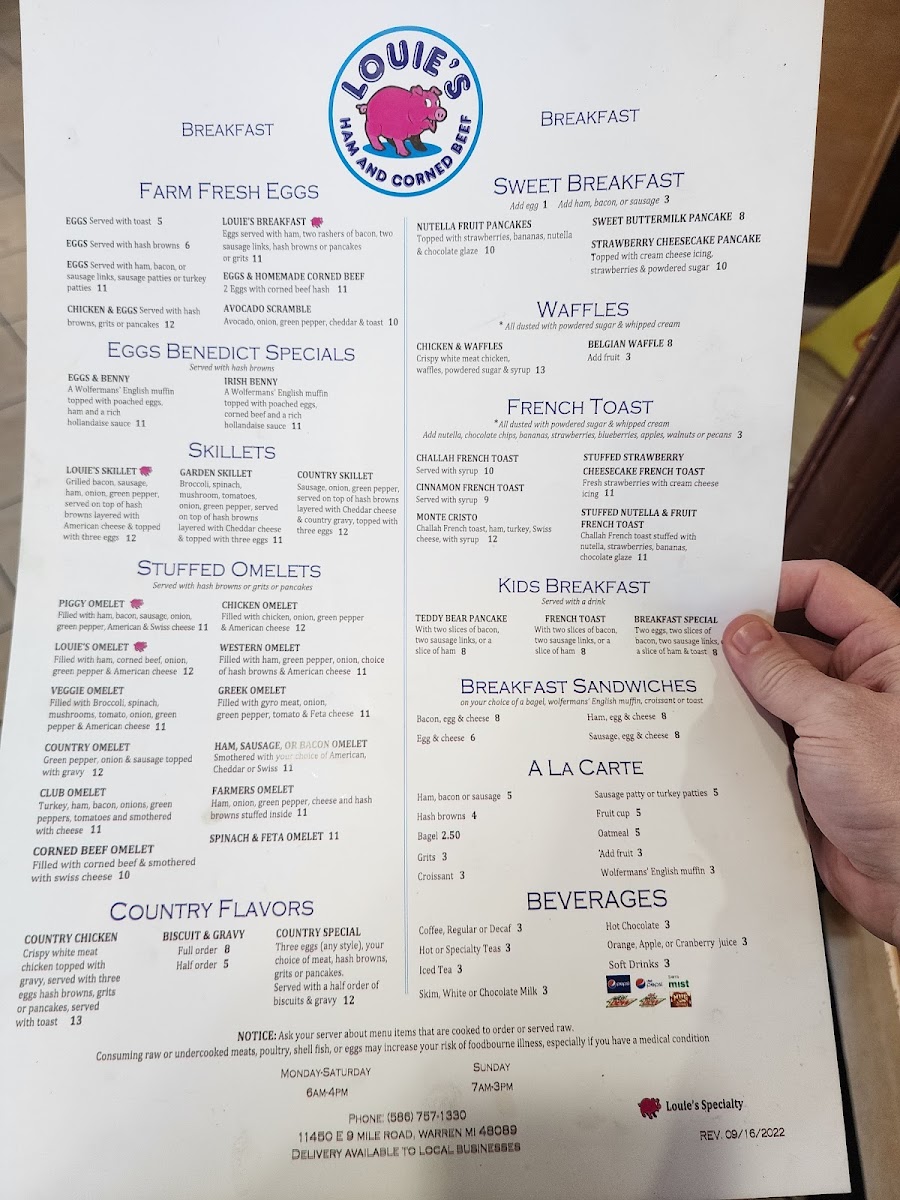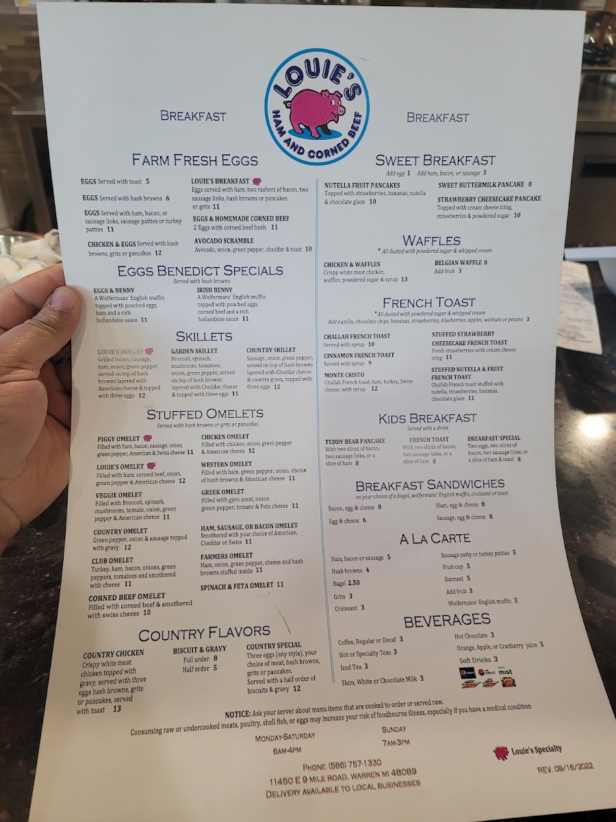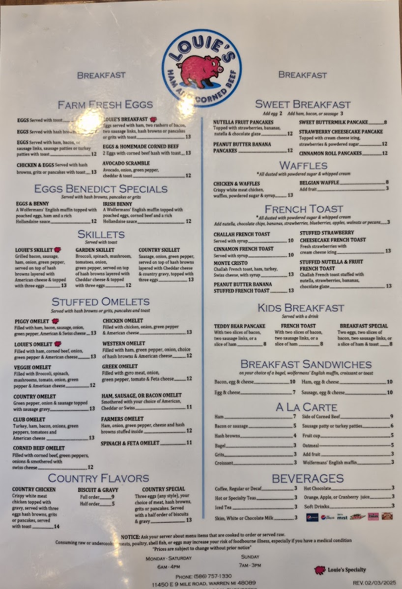 Welcome to Louie's Ham & Corn Beef, a delightful eatery located in Warren, MI. Specializing in mouthwatering stuffed omelets and hearty sandwiches, Louie's is a haven for lovers of classic comfort food. Their menu features standout items like the Piggy Omelet, brimming with ham, bacon, and sausage, or the irresistible Louie's Omelet, combining corned beef and American cheese for a flavor-packed experience. For burger enthusiasts, the Louie's Burger, topped with corned beef and a fried egg, promises to be unforgettable. The melts, including the Tuna Melt on grilled rye, offer a cozy, satisfying option. Customers rave about the attentive service, with friendly staff ensuring a pleasant dining experience. Many diners have praised the quality of the corned beef, noting its perfect seasoning and tenderness. Louie's Ham & Corn Beef is certainly a go-to spot for comfort food lovers seeking quick service and a tasty meal. Come visit and savor each bite!